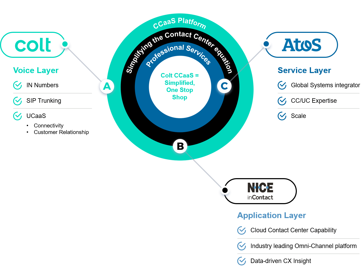 Die cloudbasierte Contact Center-Lösung von Colt kombiniert die Fähigkeiten von Colt, Atos und NICE CXone, um marktführende Konnektivität, cloudbasierte Contact Center-Expertise und digitale Transformations-Services in einer einzigen Partnerschaft und Lösung zu vereinen.
