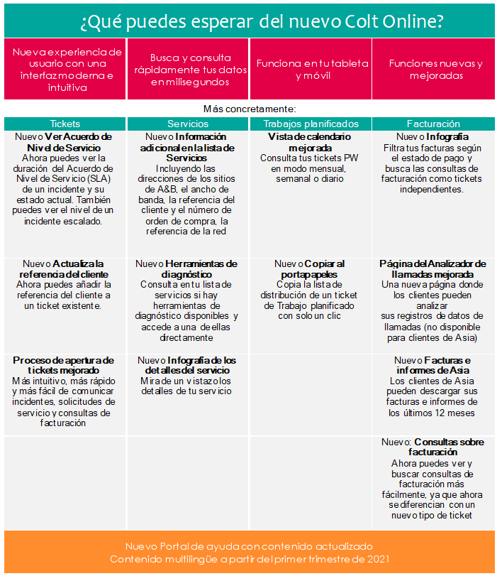 Estos cambios están disponibles para nuestros clientes en todo el mundo. Y este es solo el comienzo; el equipo de Colt trabaja continuamente para lanzar nuevas mejoras en 2021 y más allá. El objetivo de Colt es ser la empresa más orientada al cliente en la industria, esforzándose por poner al cliente en el corazón de todas las operaciones. Tanto estos cambios como los nuevos proyectos previstos para Colt Online mejorarán tu experiencia y harán que las transacciones con nosotros sean lo más fluidas posibles.
