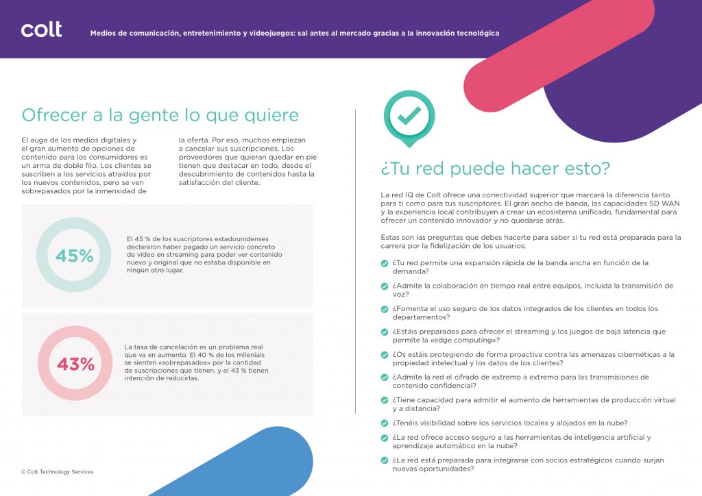 Pero los proveedores de contenido pueden mejorar su competitividad si cuentan con una tecnología potente. Con una buena conexión, estarán equipados para producir contenidos nuevos más rápido y distribuirlos, y monetizarlos de forma más eficaz.