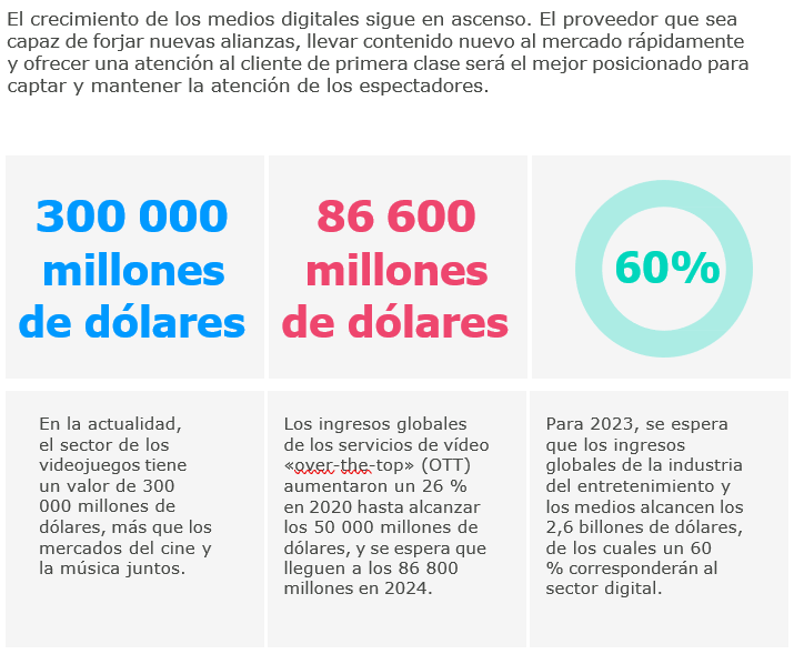 Netflix y otros grandes servicios «over-the-top» (OTT) han subido el listón en el mundo de los medios de comunicación, el entretenimiento y los videojuegos. Actualmente, el público demanda servicios fáciles de usar y con contenido interesante, y que además sean personalizados, atractivos y asequibles. El precio es fundamental para aquellos hogares cuyos ingresos se han reducido.
