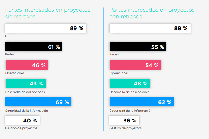 En los proyectos retrasados, la participación del equipo de Redes baja del 61 % al 55 %, mientras que la del equipo de Seguridad Informática baja solo del 69 % al 62 %. Esto pone de relieve la importancia de la colaboración, la importancia de que los especialistas en Redes y Seguridad asuman un papel central en los proyectos relacionados con la nube.