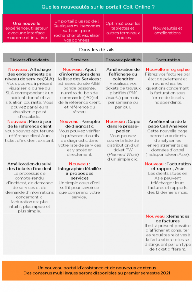 Les modifications apportées à la plateforme élèvent à un niveau supérieur les fonctionnalités les plus utilisées et les plus appréciées des utilisateurs. Nous avons tenu compte de vos commentaires et les avons intégrés au portail. N’hésitez pas à nous contacter par l’intermédiaire de votre chargé de compte ou, directement, en cliquant sur le bouton Commentaires de Colt Online.