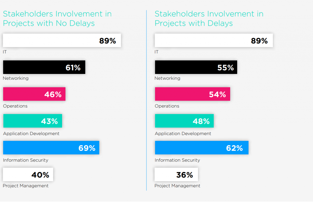 En ce qui concerne les projets retardés, la participation des équipes réseau passe de 61 % à 55 %, tandis que celle des équipes en charge de la sécurité de l’information chute de 69 % à 62 %. Ces chiffres soulignent l’importance de la collaboration, les spécialistes réseau et sécurité jouant un rôle central dans les projets de migration vers le cloud.