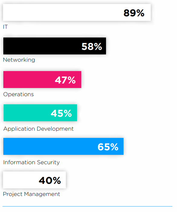 Des développeurs aux ingénieurs réseau en passant par les responsables de l’exploitation et les équipes de sécurité, le NetOps concerne différentes fonctions de l’entreprise. C’est pourquoi une collaboration et une communication croisées doivent être les deux piliers de votre projet. Nous avons étudié l’état actuel du NetOps en cherchant à connaître les méthodes de travail appliquées par certaines entreprises ainsi que les acteurs impliqués. Dans le cadre de notre enquête, nous avons interrogé 255 responsables informatiques de haut niveau de la région EMEA à propos de leurs projets de migration vers le cloud. Les résultats nous indiquent que les personnes concernées appartiennent aux secteurs de l’informatique (DSI), de la sécurité de l’information, des réseaux, de l’exploitation, du développement d’applications et de la gestion de projets.