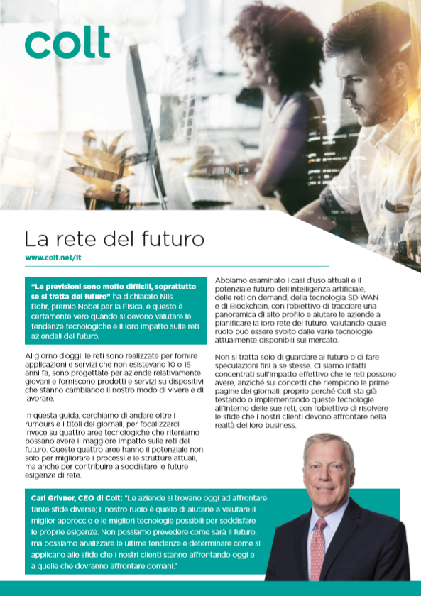 Non si tratta solo di guardare al futuro o di fare speculazioni fini a se stesse. Ci siamo infatti concentrati sull’impatto effettivo che le reti possono avere, anziché sui concetti che riempiono le prime pagine dei giornali, proprio perché Colt sta già testando o implementando queste tecnologie all’interno delle sue reti, con l’obiettivo di risolvere le sfide che i nostri clienti devono affrontare nella realtà del loro business.