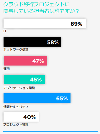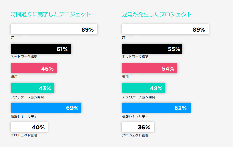 遅延が発生したプロジェクトでは、ネットワーク構築チームの関与は61%から55%に低下し、ITセキュリティの関与は69%から 62%に低下しています。この結果は、ネットワーク構築とセキュリティのスペシャリストとの共同作業がクラウドプロジェクトにもたらす重要性を示しています。