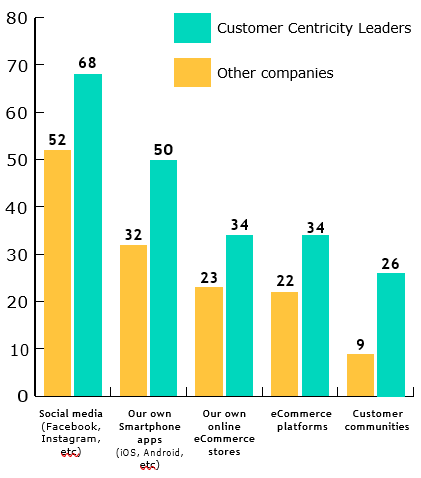 Digital channels with the biggest usage gap between customer centricity leaders and laggards