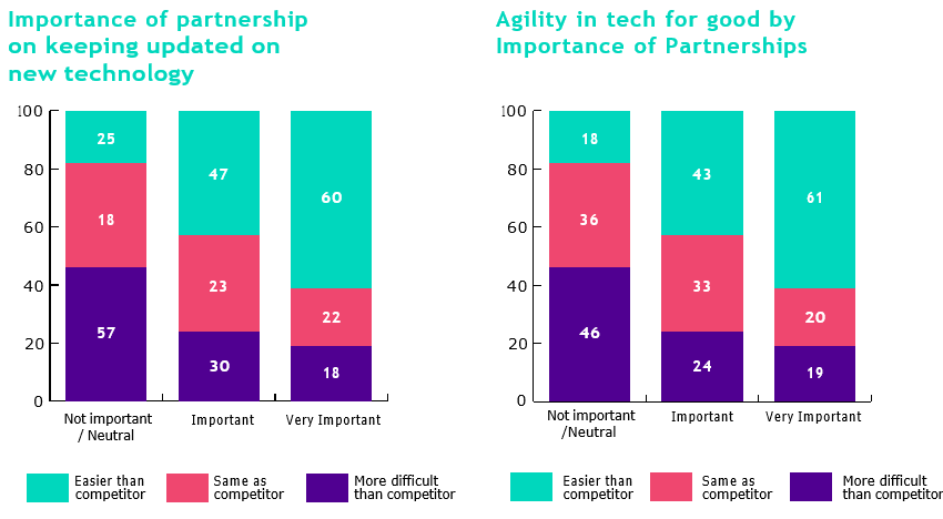 CIOs who highly value their partnerships also show much greater enterprise agility overall. Approximately 60% of them rank themselves as more agile than competitors in customer centricity as well as tech for good.