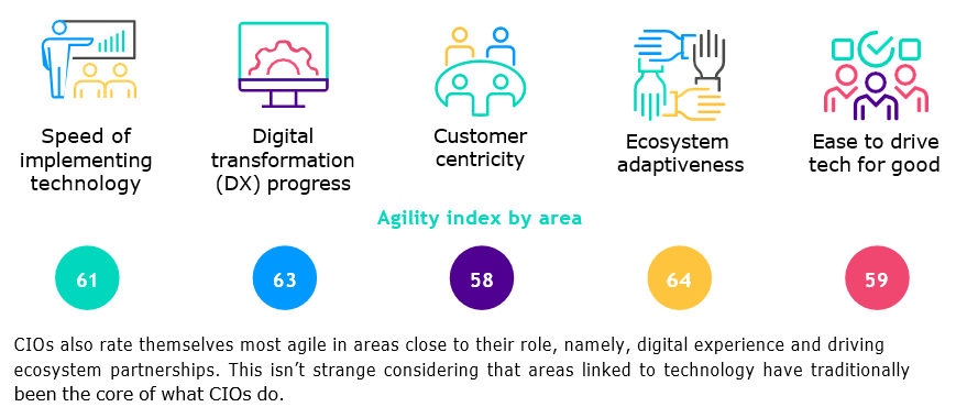 CIOs also rate themselves most agile in areas close to their role, namely, digital experience and driving ecosystem partnerships. This isn’t strange considering that areas linked to technology have traditionally been the core of what CIOs do.