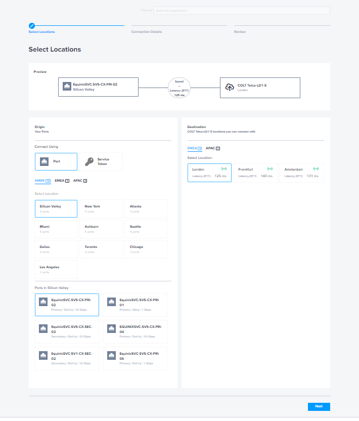 STEP 1: In the Equinix Fabric portal: Request a local intra-DC/ metro connection between the Equinix Fabric port and Colt