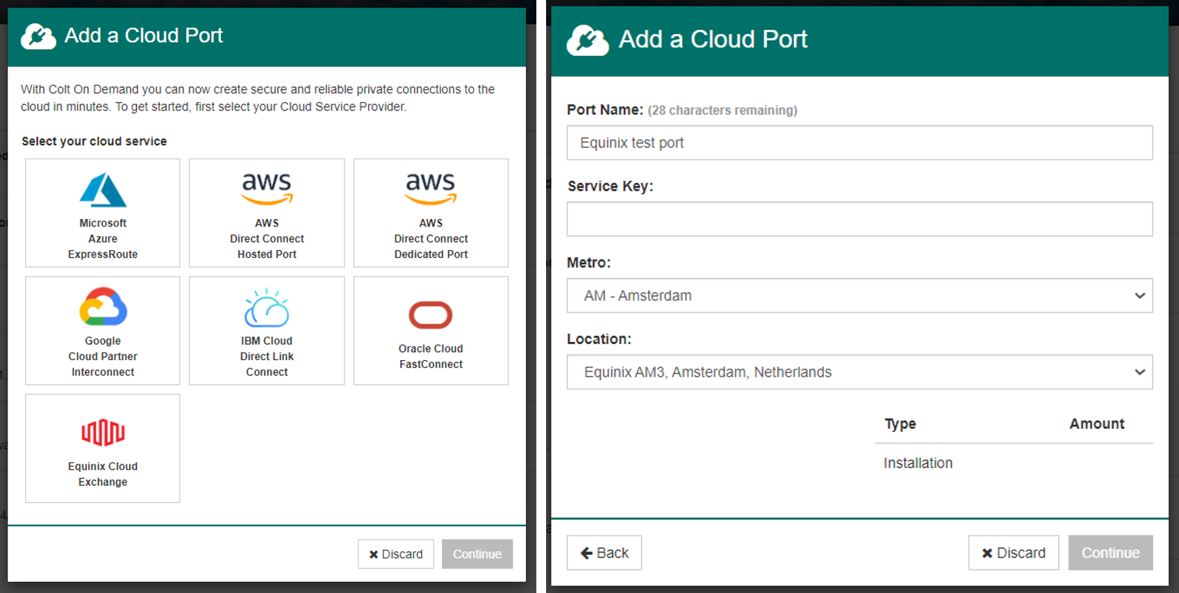 Once the connection has been created, customers will receive a service key (this is called a “unique ID” in Equinix Fabric. This service key is then used to create a virtual cloud port in the Colt On Demand platform, and will be completed in minutes.