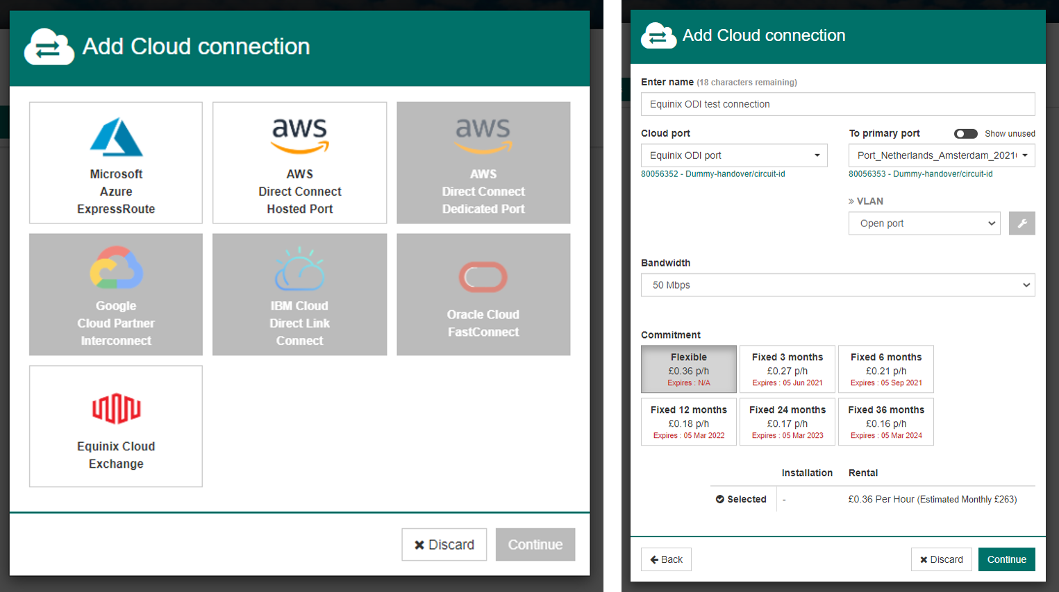 Once the virtual cloud port has been created, an On Demand connection should be created between the remote data centre / enterprise office port and the Equinix virtual cloud port.